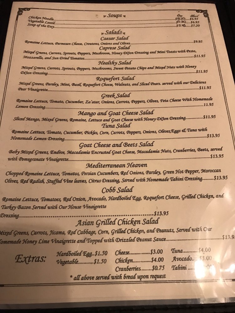 Romaine, tomato, cucumber, onions, carrots, peppers, kalamata olives, feta cheese, and zaatar, with homemade lemon dressing. Gluten-free.